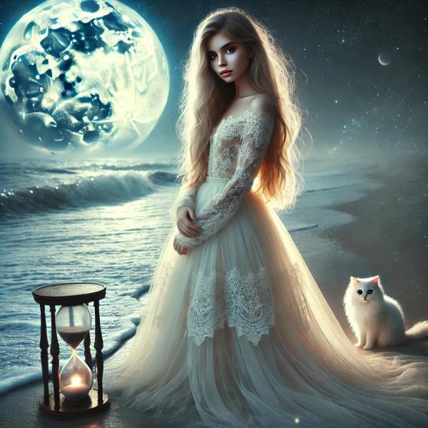 Une jeune femme marche au bord du rivage. Ses pas s’impriment dans l’humide, fragiles, déjà effacés par l’eau mouvante. Elle sourit, mais son regard fixe l’horizon, cet ailleurs que le temps dérobe. Dans ses bras, un chat s’étire, indifférent à l’éphémère, ses yeux dorés comme un éclat du soleil mourant.